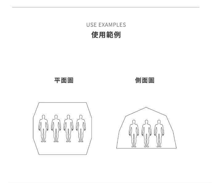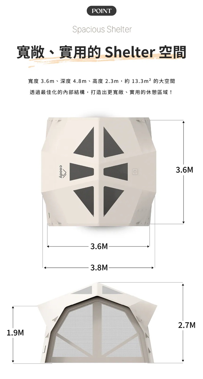 ・長360cm、寬度380cm(包含雨遮)、高度270cm頂高