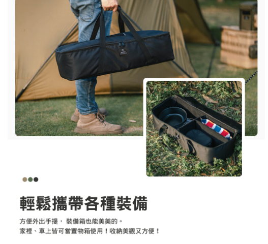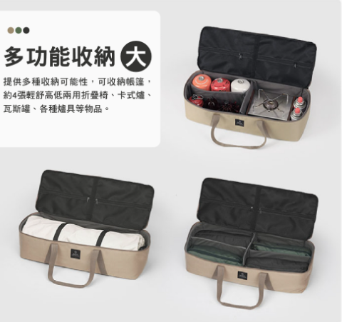.多功能收納-大號,提供多種收納可能性,可收納帳篷,約4張輕舒高低兩用折疊椅、卡式爐、瓦斯罐、各種爐具等物品。
