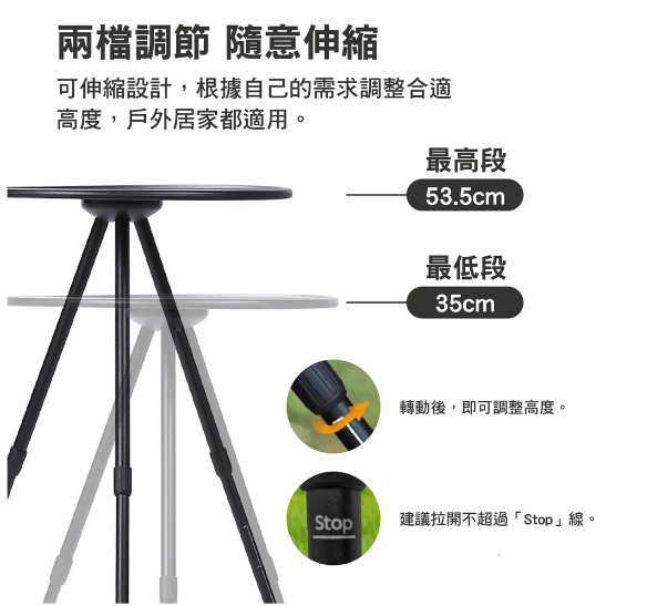 .角轉動後,即可調整高度 / 建議拉開不超過「Stop」線