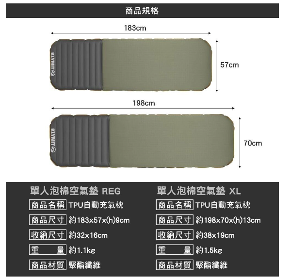充氣尺寸 : 198(長)x74(寬)x13cm(厚度)